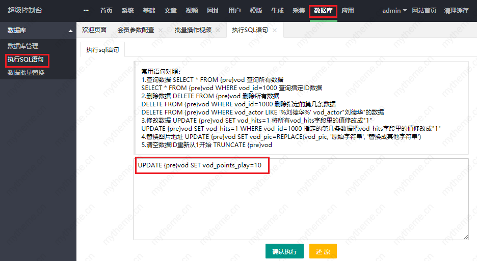 SQL语句2:UPDATE {pre}vod SET vod_points_play=10WHERE vod_id=1000(此句的意思,视频ID为1000的视频,设置为10积分收费)