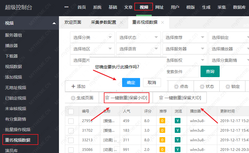 1.苹果cms系统后台管理“视頻”→“重名视頻数据”随后刪除选取→“一键删重”,保留大ID或者小ID都是可以的,删掉其中一种 。