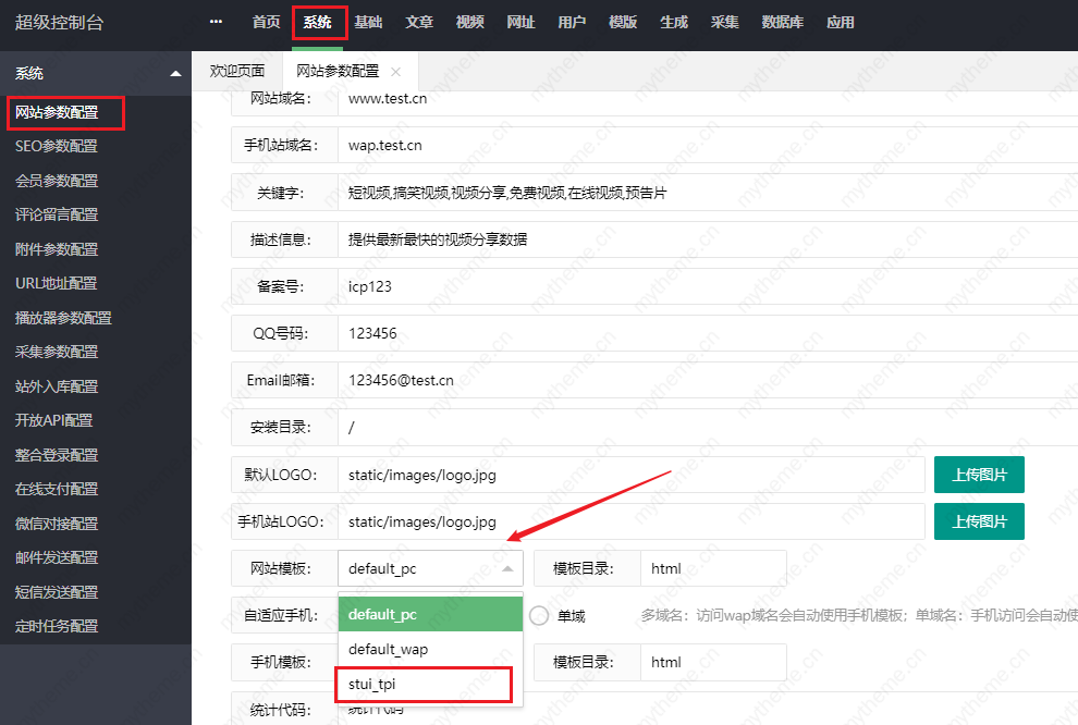 4,来到苹果cms后台切换我们刚才上传的模板。找到【系统】-【网站参数配置】-【网站模板】切换成我们刚才上传的模板。