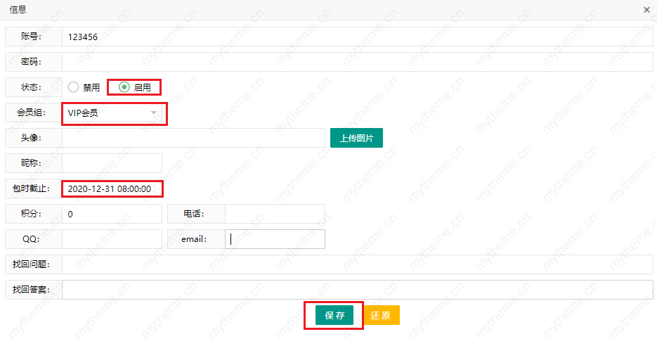 9,来到编辑页面:选择状态为启用,会员组vip,包时到期时间选择2020-12-31 最后保存。会员到期后,自动降级为默认会员,播放收费视频将扣除积分