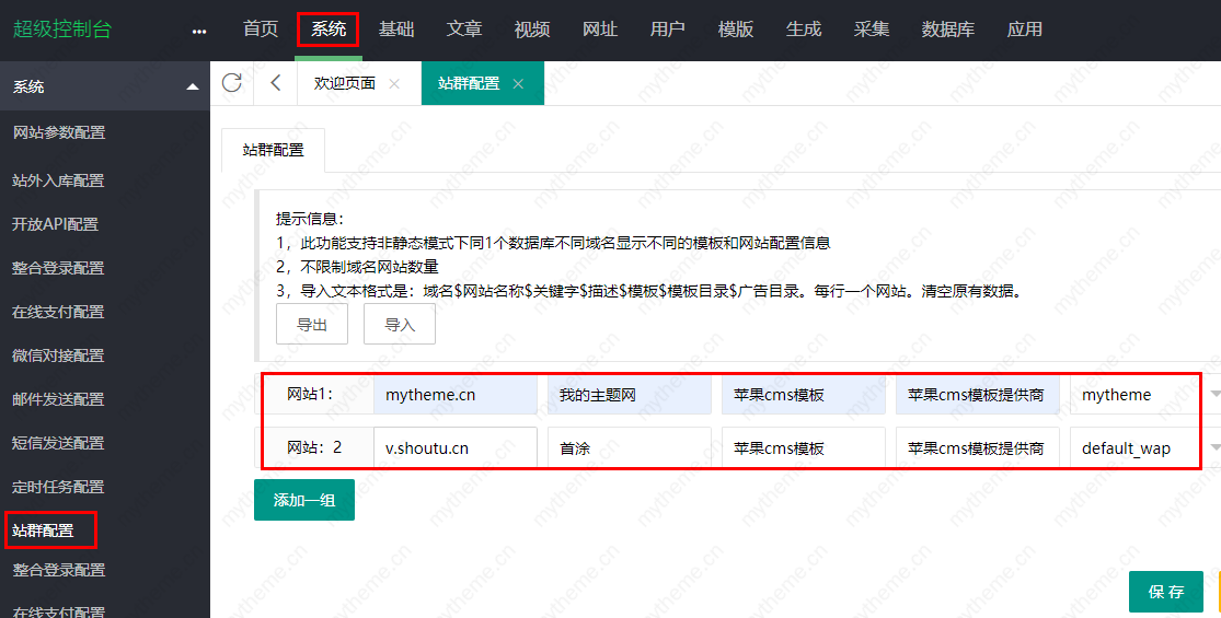 具体的操作使用步骤如下截图,进入到苹果cms系统后台,找到站群配置,然后进行域名添加,图中为你举了2个例子加以说明和理解。这里需要注意的是域名,这里添加的域名必须是你自己的域名而且解析在了同一个服务器上才可以这样使用。也可以参考我的主题网之前分享过的教程:多个域名打开同一个网站的设置方法