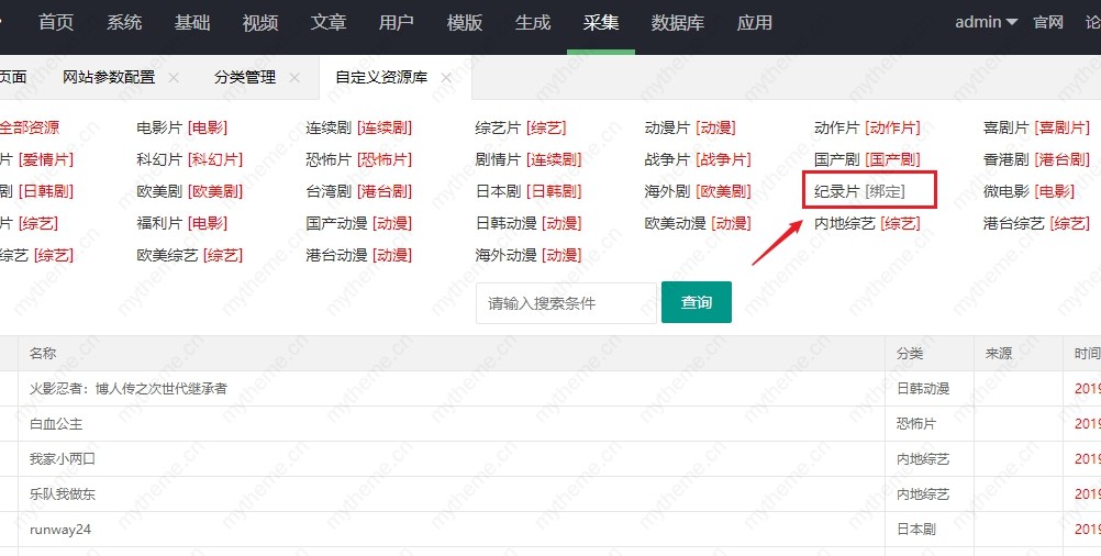 有时候我们在解决苹果cms怎么设置自动采集进行绑定分类的时候 发现有些分类系统是没有的,比如下图的这个纪录片 苹果系统默认是没有这个分类的,如果你不想分这么细的话可以随便绑定到一个分类上 如果不想采集的话可以不绑定,如果我们需要网站上有记录片这个分类的话这就需要我们手动添加分类来进行绑定。下面我的主题网就说下苹果cms怎么添加分类的具体操作步骤。