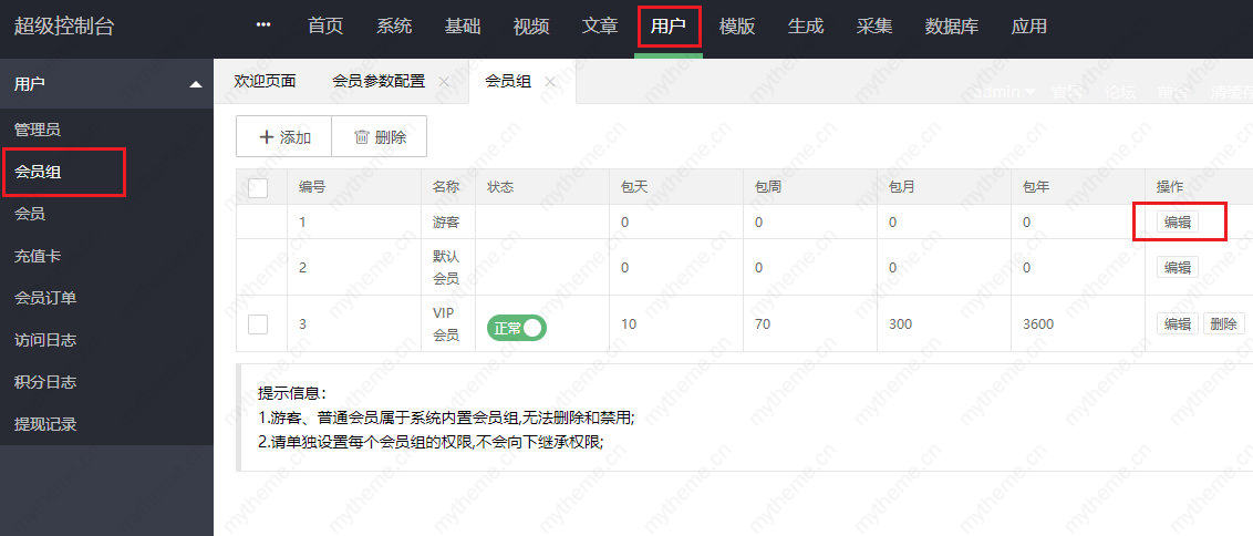 1,提示权限不足这种情况是苹果cms新添加了分类,但是没有修改权限造成的。 2,解决办法:找到用户>>会员组>游客>编辑 3,修改游客权限,全部勾选后保存