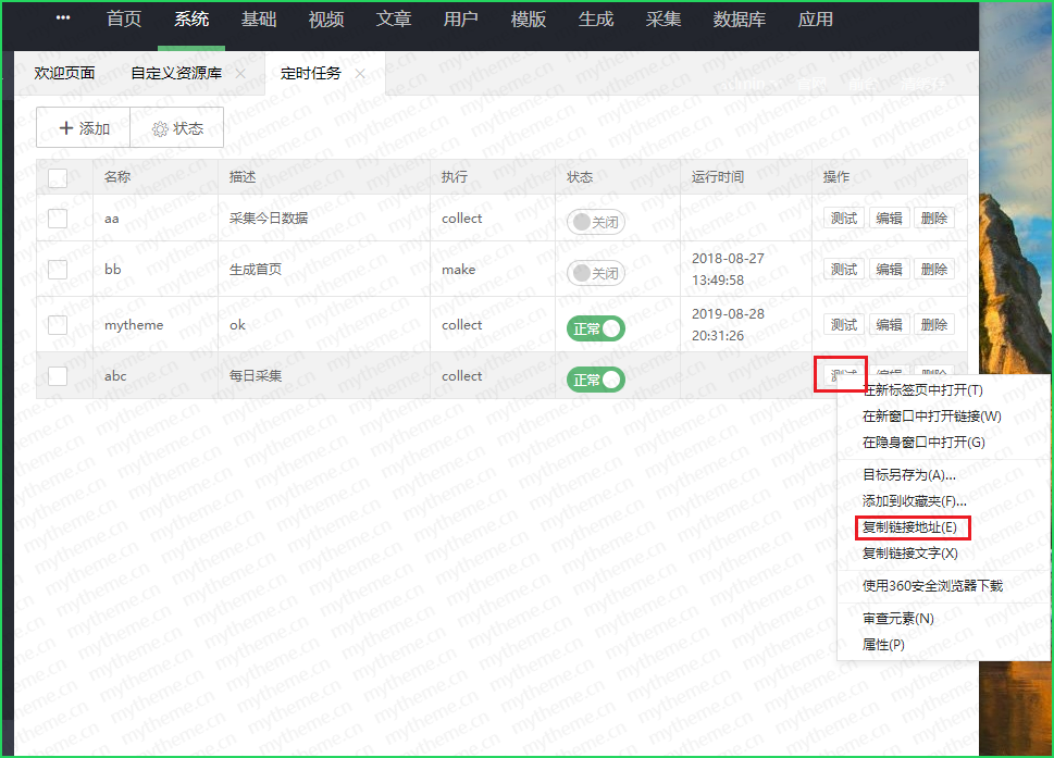 5.找到我们刚才设置的任务后鼠标右键测试复制链接地址