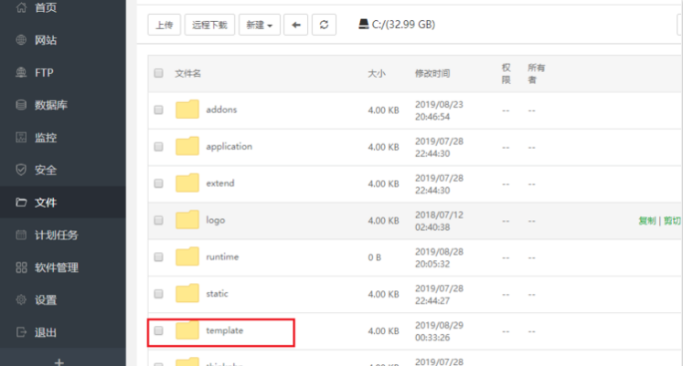 3、从宝塔面板进入我们网站的根目录,打开“template”目录,上传我们下载的模板文件夹。(也可以用FTP工具上传至template目录)。